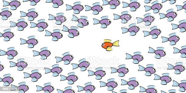 Swim against the tide – one fish is swimming in another direction – symbol for courage, individuality, loneliness or different lifestyle. Isolated vector comic illustration on white background.